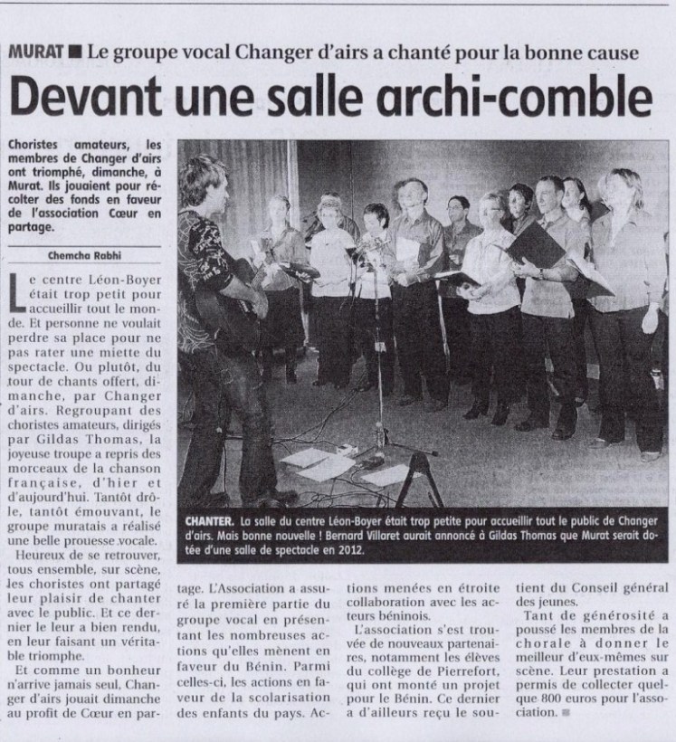 La Montagne Publié le mars 4, 2009février 20, 2021 par coeurenpartage Concert de charité au profit de Cœur en Partage.Article paru dans La Montagne le 04 mars 2009. Partager : Partager sur X(ouvre dans une nouvelle fenêtre) X Partager sur Facebook(ouvre dans une nouvelle fenêtre) Facebook J’aime chargement… Similaire