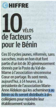 Le Parisien Publié le juillet 6, 2011février 26, 2021 par coeurenpartage Don de vélos de La Poste à Coeur en Partage.Article paru dans Le Parisien le 06 juillet 2011. Partager : Partager sur X(ouvre dans une nouvelle fenêtre) X Partager sur Facebook(ouvre dans une nouvelle fenêtre) Facebook J’aime chargement… Similaire