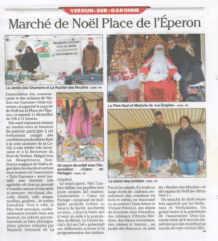 Le Petit Journal Publié le février 11, 2022février 11, 2022 par coeurenpartage Coeur en Partage au marché de Noël de Verdun-sur-Garonne, Article paru dans Le Petit Journal le 14 décembre 2021 Partager : Partager sur X(ouvre dans une nouvelle fenêtre) X Partager sur Facebook(ouvre dans une nouvelle fenêtre) Facebook J’aime chargement… Similaire